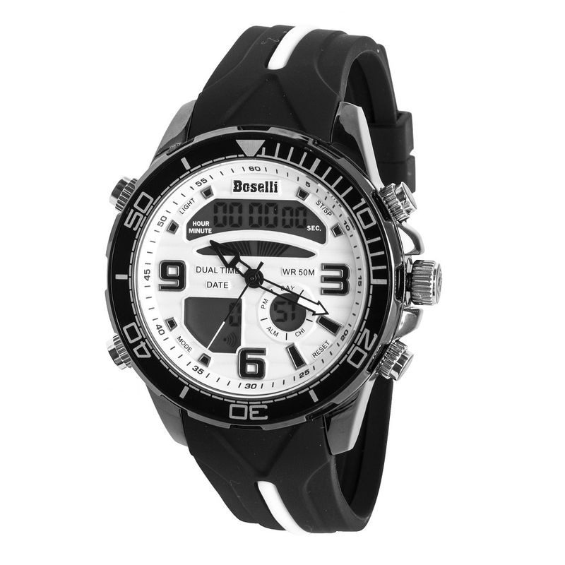 Reloj sport con maquinaria japonesa SEIKO-EPSON AL35 y panel digital de alta calidad que garantizan la precisa medición del tiempo.Caja de acero pintada con tecnología ION PLATING (IP) que brinda mayor adherencia y durabilidad de la pintura.Corona, pulsadores y broche en acero inoxidable.Correa de caucho de alta calidad con recubrimiento hidrofóbico. Luna de cristal mineral. Resistencia al agua 5ATM (50 metros) FUNCIONES: Hora analógica y digital.Calendario completo: día, mes, año.Panel digital con luz LED.Formato ajustable 12/24 horas.Cronometro segundero. Alarma ajustable. Función campaneo.Incluye reloj Boselli, Caja original Boselli, Publicitarios de la marca.