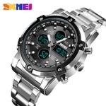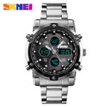 Reloj SKMEI 1389 Plateado con correa de acero y fondo gris. Un sofisticado reloj digital y analógo que complementa tu look en toda ocasión. Sus características resaltantes como cronometro, fecha, alarma, timer y luz LED lo hacen aún más interesante. Su capacidad de configurar dos horas digitales además de hora analoga y su correa dorada de acero le añaden elegancia. Sus 164g de peso lo hacen un reloj de fuerte presencia y su dial de 58x48mm se acoplan perfectamente a la muñeca y le permiten fácilmente ver la hora en todo momento. Su diseño 3atm resistente al agua lo hacen aún más versátil.