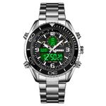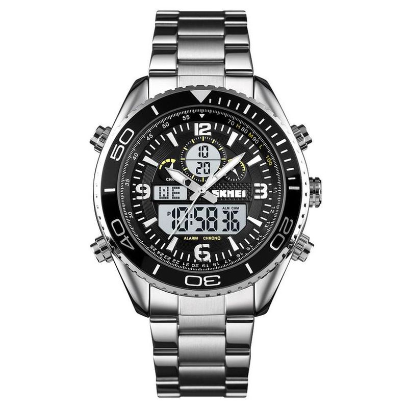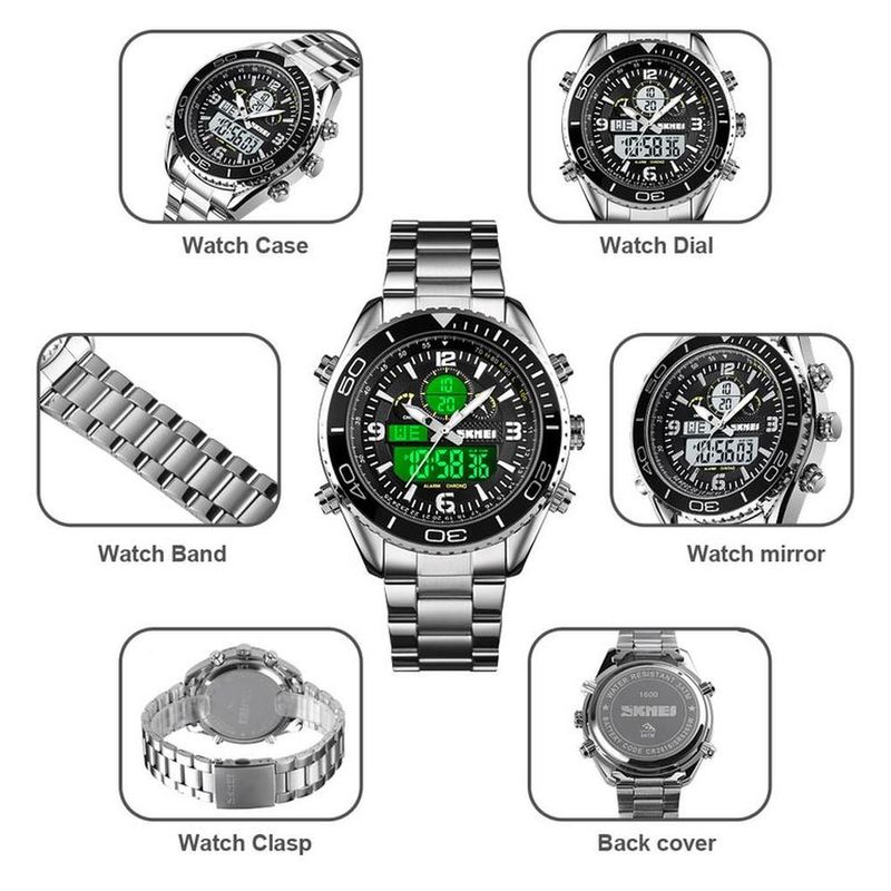 Reloj SKMEI 1600 plateado con correa de acero. Un sofisticado reloj digital y analógo que complementa tu look en toda ocasión. Sus características resaltantes como cronometro, fecha, alarma, timer y luz LED lo hacen aún más interesante. Su capacidad de configurar dos horas digitales además de hora analoga y su correa dorada de acero le añaden elegancia. Sus 147 gramos de peso lo hacen un reloj de fuerte presencia y su dial de 46x52mm se acoplan perfectamente a la muñeca y le permiten fácilmente ver la hora en todo momento. Su diseño 3atm resistente al agua lo hacen aún más versátil.