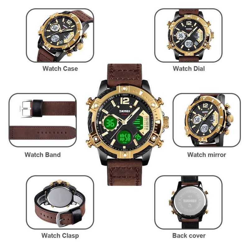 Reloj SKMEI 1618 negro con correa marron de cuero. Un sofisticado reloj digital y analógo que complementa tu look en toda ocasión. Sus características resaltantes como cronometro, fecha, alarma, timer y luz LED lo hacen aún más interesante. Su capacidad de configurar dos horas digitales además de hora analoga y su correa marrón de cuero le añaden elegancia. Sus 102 gramos de peso lo hacen un reloj de fuerte presencia y su dial de 48mmx54mm se acoplan perfectamente a la muñeca y le permiten fácilmente ver la hora en todo momento. Su diseño 3atm resistente al agua lo hacen aún más versátil.