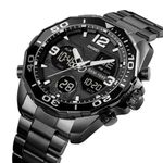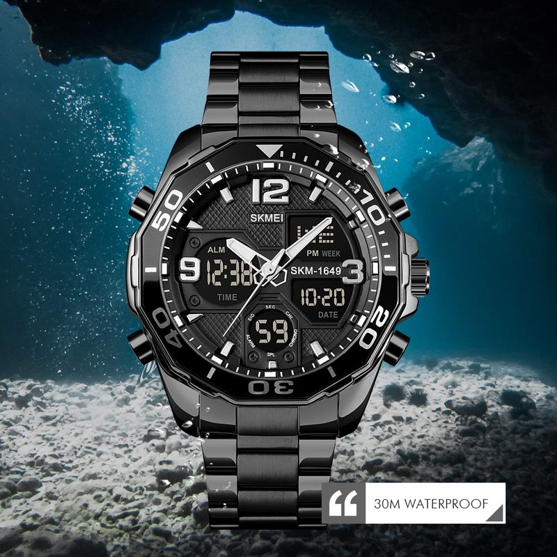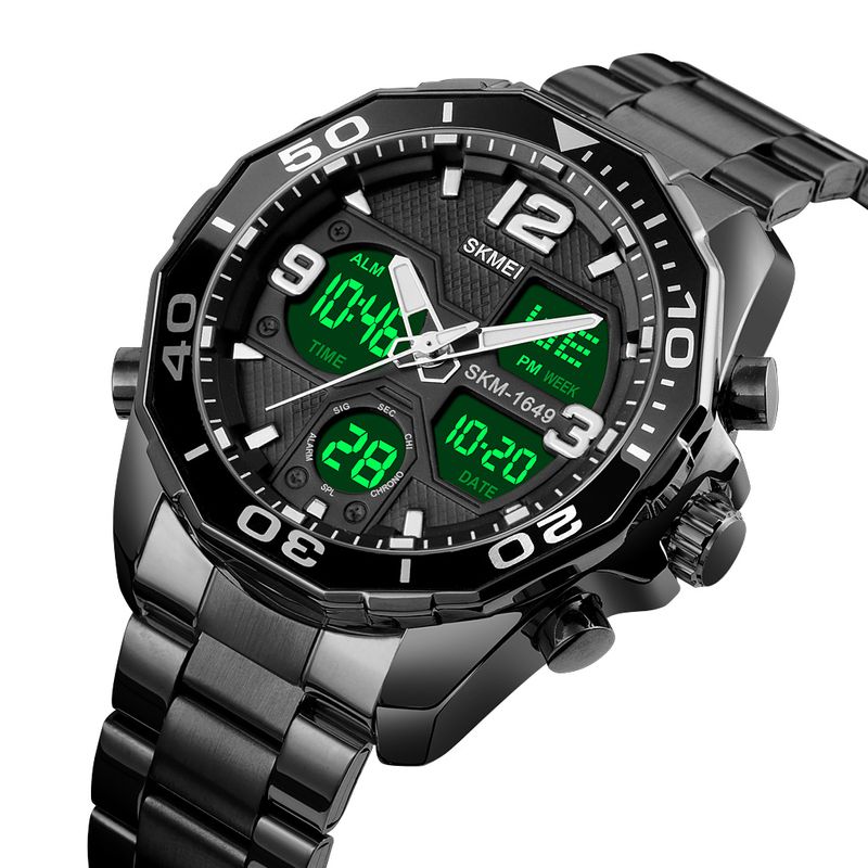 Reloj SKMEI 1649 negro correa acero. Un sofisticado reloj digital que complementa tu look en toda ocasión. Sus características resaltantes como cronometro, fecha, alarma, timer y luz LED lo hacen aún más interesante. Su capacidad de configurar horas digitales y analogica y su correa de acero le añaden elegancia. Sus 152g de peso lo hacen un reloj de fuerte presencia y su dial de 48x52mm se acoplan perfectamente a la muñeca y le permiten fácilmente ver la hora en todo momento. Su diseño 3atm resistente al agua lo hacen aún más versátil. ¡Adquiérelo ahora mismo!