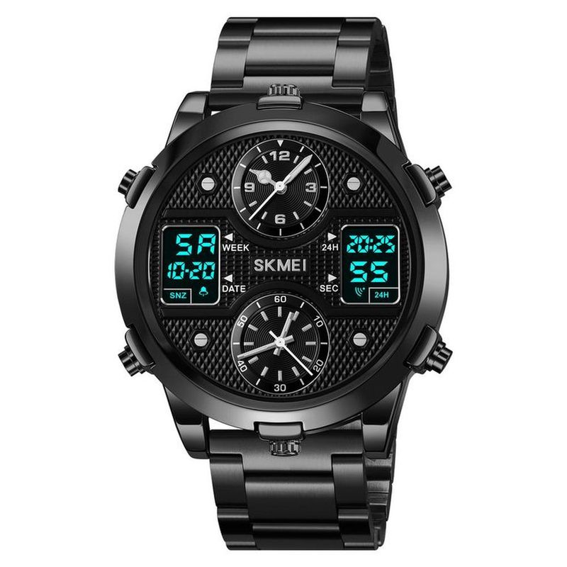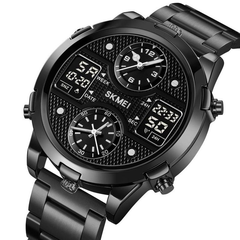 Reloj SKMEI 2212 con 6 botones negro con correa de acero. Un sofisticado reloj digital y analógo que complementa tu look en toda ocasión. Sus características resaltantes como cronometro, fecha, alarma, timer y luz LED lo hacen aún más interesante. Su capacidad de configurar dos horas digitales además de hora analoga y su correa dorada de acero le añaden elegancia. Sus 177g de peso lo hacen un reloj de fuerte presencia y su dial de 51.2x58mm se acoplan perfectamente a la muñeca y le permiten fácilmente ver la hora en todo momento. Su diseño 3atm resistente al agua lo hacen aún más versátil.