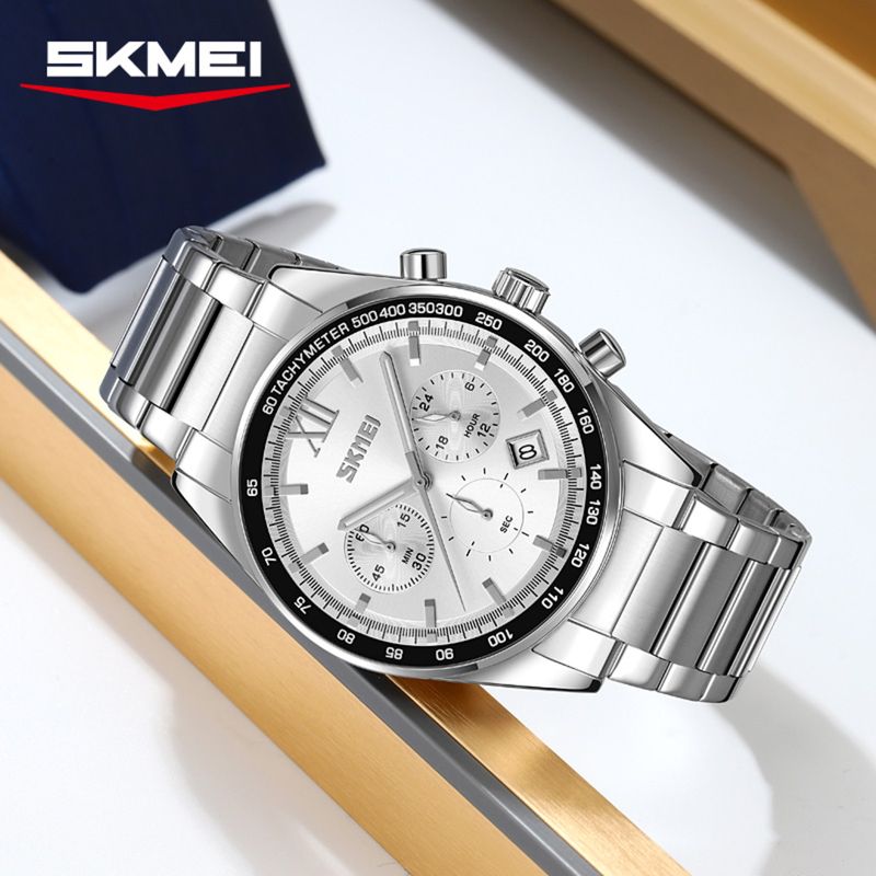 Reloj SKMEI 9096 Plateado Fondo plateado con dial color plata es un sofisticado reloj analógo que complementa tu look en toda ocasión. Sus características resaltantes como cronometro, fecha y diales pequeños lo hacen aún más interesante. Su correa plateada de acero le añaden elegancia. Sus 135g de peso lo hacen un reloj de fuerte presencia y su dial de 41mmx50mm se acopla perfectamente a la muñeca y le permiten fácilmente ver la hora en todo momento. Su diseño 3atm resistente al agua (no sumergible) lo hacen aún más versátil.