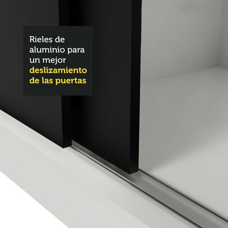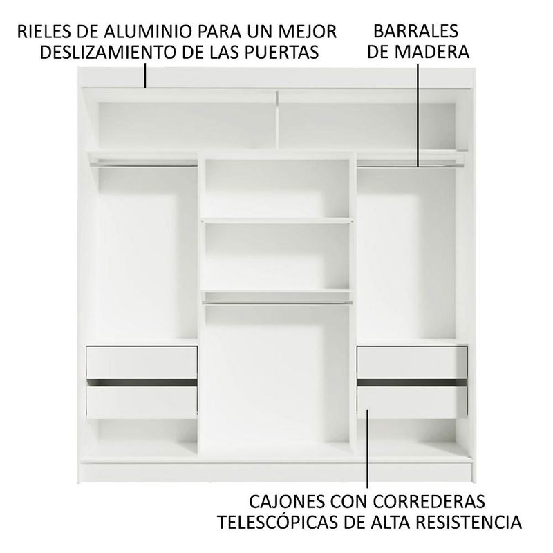 Son tres puertas correderas con rieles de aluminio y deslizamiento suave, que optimizan el espacio del cuarto, sin estorbar al abrir. Además, la puerta central cuenta con espejos que amplían el ambiente y resultan muy prácticos en el uso diario.