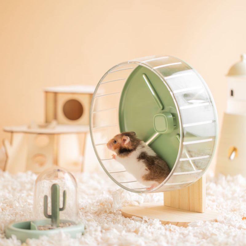 Juguete tipo rueda de ejercicio para mascotas pequeñas como hamsters o roedores pequeños.