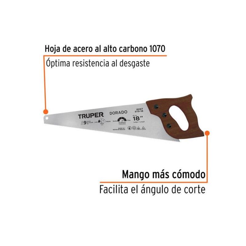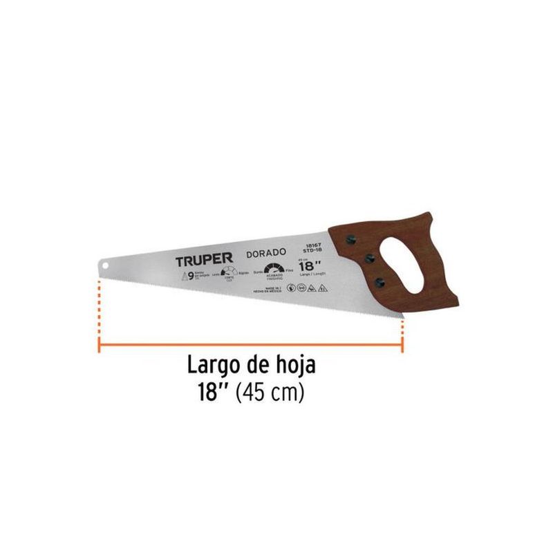 Serrucho 18" Dorado, 9 DPP, Truper - 18167 Dientes por pulgada 9 Espesor de hoja 0.9 mm Largo de hoja 18" (45 cm) Hoja de acero al alto carbono 1070 para óptima resistencia al desgaste Espesor de hoja: 0.9 mm Mango más cómodo que facilita el ángulo de corte Madera