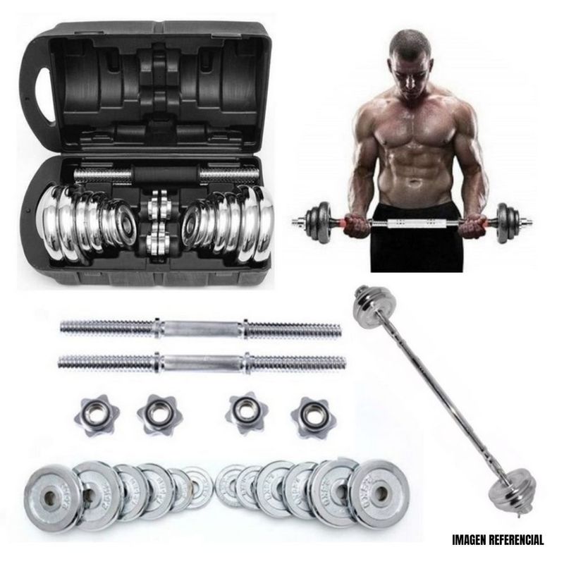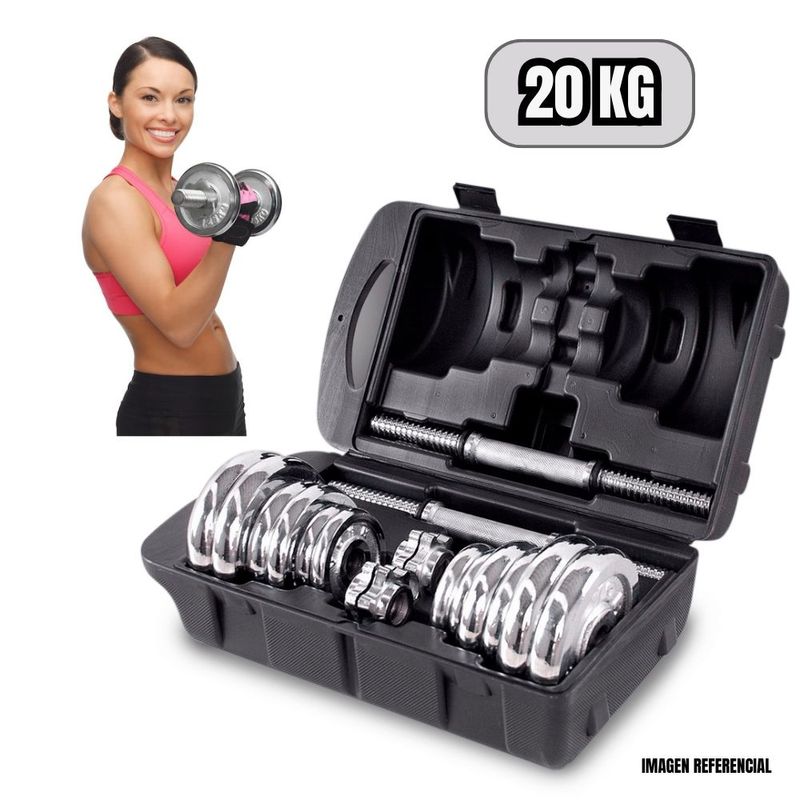 • Maleta De Pesas Cromadas De 20 Kg. + 2 Mancuernas + Adaptador A Barra Recta + Seguros