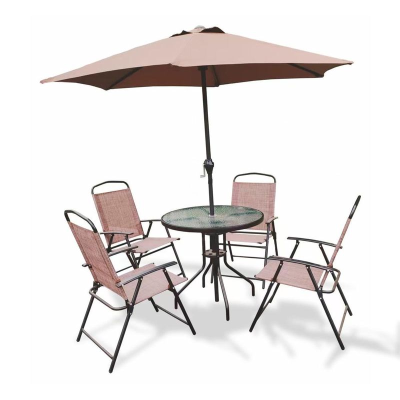 Convierte tu terraza en un espacio práctico y acogedor con el set de terraza Recife 6 piezas, perfecto para reuniones familiares o momentos de descanso al aire libre. Su mesa de vidrio templado y sillas plegables de estructura metálica combinan ligereza, funcionalidad y resistencia. Además, incluye un quitasol que brinda protección contra el sol, haciendo de este conjunto una solución completa para disfrutar en exteriores.
