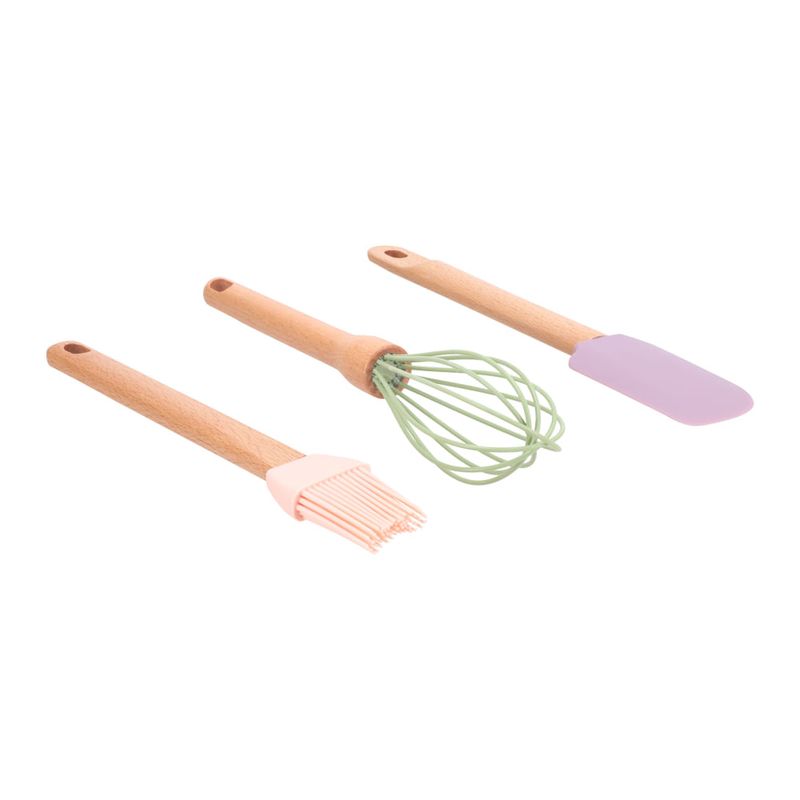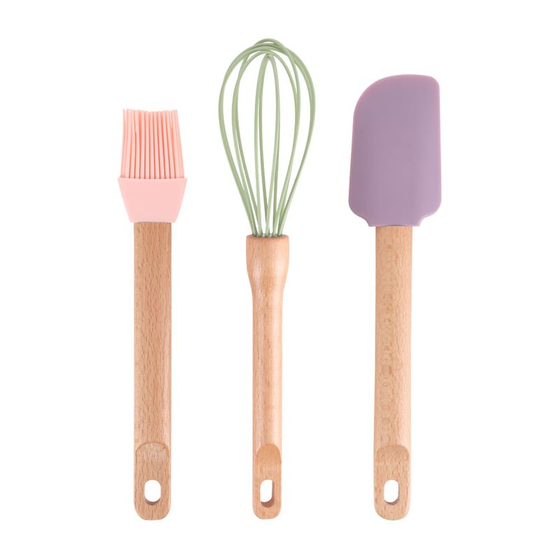 Set de 3 utensilios de silicona y madera para hacer preparaciones de repostería.