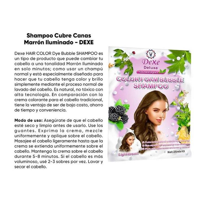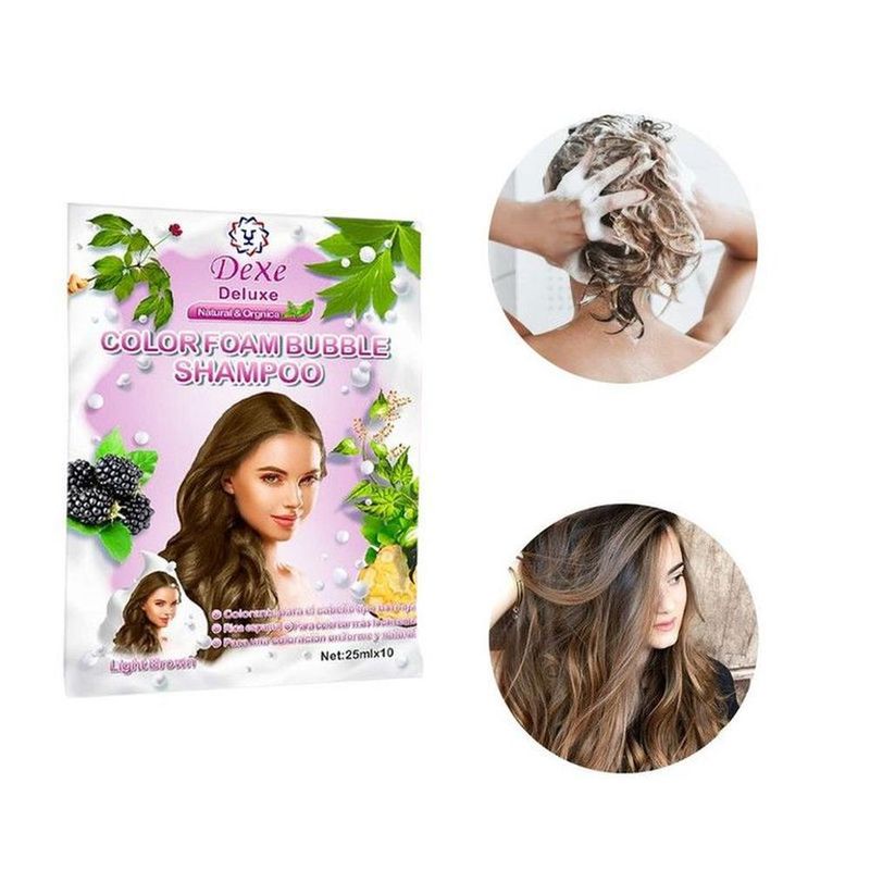 Dexe HAIR COLOR Dye Bubble SHAMPOO es un tipo de producto que puede cambiar tu cabello a una tonalidad Marrón Iluminado en solo minutos; como usar un champú normal y está especialmente diseñado para hacer que tu cabello tenga color y brillo simplemente mediante el proceso normal de lavado del cabello. Es natural, no tóxico con alta tecnología. En comparación con la crema colorante para el cabello tradicional, tiene la ventaja de ser de bajo costo, ahorro de tiempo y conveniencia.