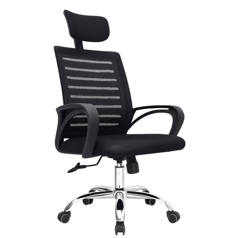 Silla ergonómica con cabecero fabricado en malla y ajuste de altura, diseñada para brindar mayor confort, soporte y adaptabilidad al usuario. Su respaldo en malla de poliéster altamente transpirable ofrece frescura, ergonomía y un soporte lumbar natural que favorece una postura saludable. Dispone de brazos fijos en polipropileno (PP) con estructura sólida, funcional y de diseño contemporáneo. El asiento, amplio y cómodo, está elaborado con espuma laminada de alta densidad y tapizado en tejido textil resistente, garantizando confort prolongado durante la jornada. Incorpora un mecanismo basculante con bloqueo en una posición y perilla de ajuste de tensión, que permite una inclinación adaptable y relajante. Su base robusta de nylon reforzado de 320 mm de diámetro proporciona estabilidad, resistencia estructural y seguridad en el uso diario, mientras que las ruedas dobles de nylon de 50 mm aseguran un desplazamiento fluido, silencioso y sin esfuerzo sobre distintos tipos de superficie.