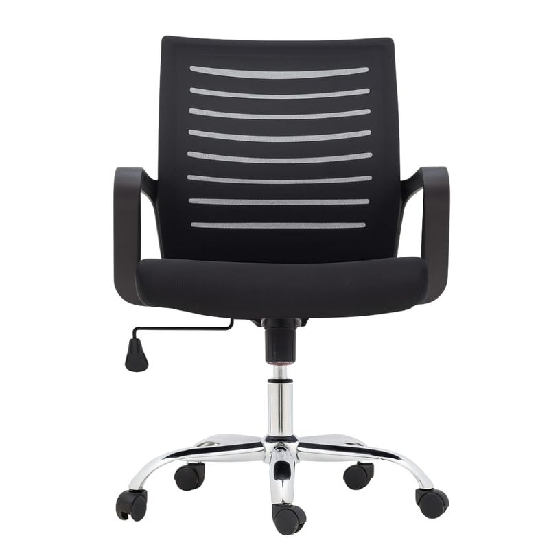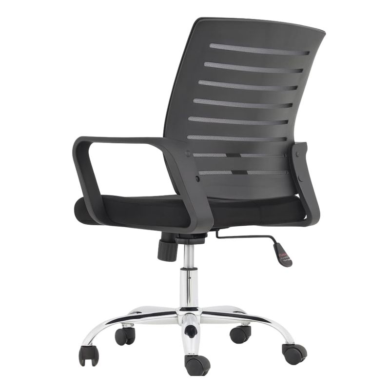 Silla ergonómica con espaldar en malla resistente, diseñada para ofrecer frescura, soporte ergonómico y ventilación continua durante el uso prolongado. Sus brazos fijos, fabricados en polipropileno de alta durabilidad, brindan un apoyo cómodo para los antebrazos y contribuyen a mejorar la postura. El asiento, amplio y confortable, está equipado con acolchado de espuma de alta densidad y tapizado en textil suave al tacto, ideal para largas jornadas de trabajo. Incorpora un mecanismo basculante que permite una inclinación natural del respaldo, proporcionando mayor confort y descanso. Su base sólida de 320 mm está disponible en dos versiones: acabado cromado con estilo moderno o nylon reforzado para una resistencia superior. Las ruedas dobles de nylon de 50 mm garantizan un desplazamiento suave, silencioso y seguro sobre diferentes tipos de superficie.