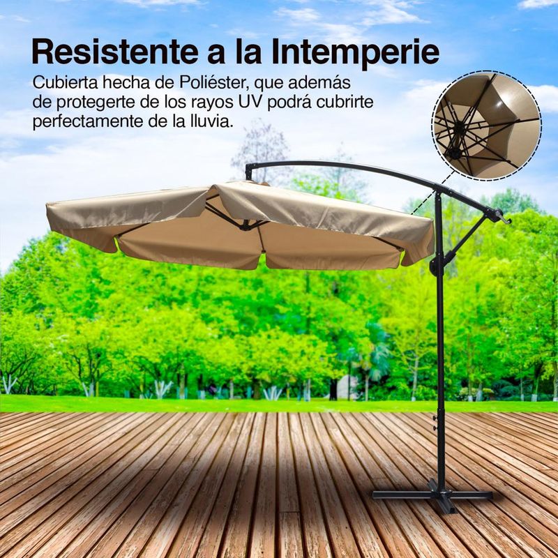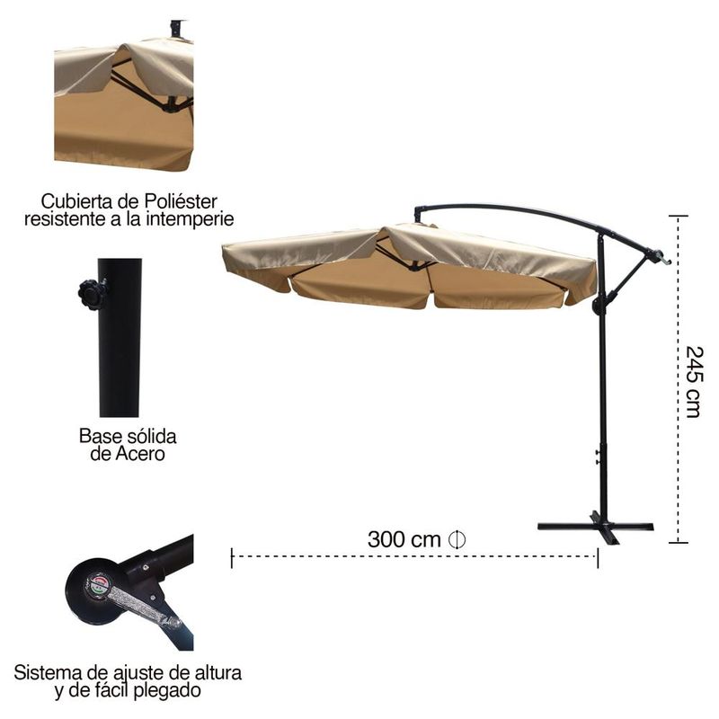 Con un diámetro de 300 cm y un alto de 245 cm, esta sombrilla cubre una amplia área, brindándote sombra y protección contra los dañinos rayos UV. Su cubierta de poliéster resistente a la intemperie no solo te protege del sol, sino que también te resguarda de la lluvia ligera, asegurando tu comodidad en cualquier condición climática.