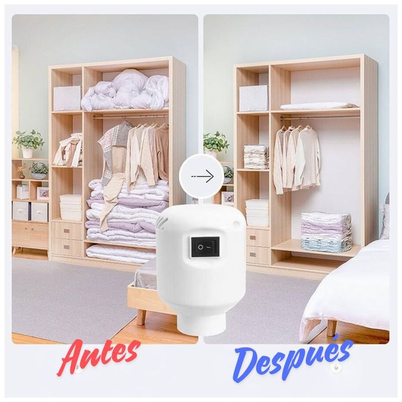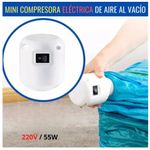 La Solución perfecta para el ahorro del espacio en un instante, sin estar armando la aspiradora o bombeando con un succionador manual. Elimina fácilmente todo el exceso de aire en la bolsa de almacenamiento al vacío con menos tiempo y esfuerzo, gracias a este no necesitarás usar la bomba manual para sacar el aire de la bolsa. Ahorra espacio en tu armario. Simplemente conecte el enchufe y luego colóquelo en la válvula y enciéndalo. Luego solo tendrás que esperar unos segundos.
