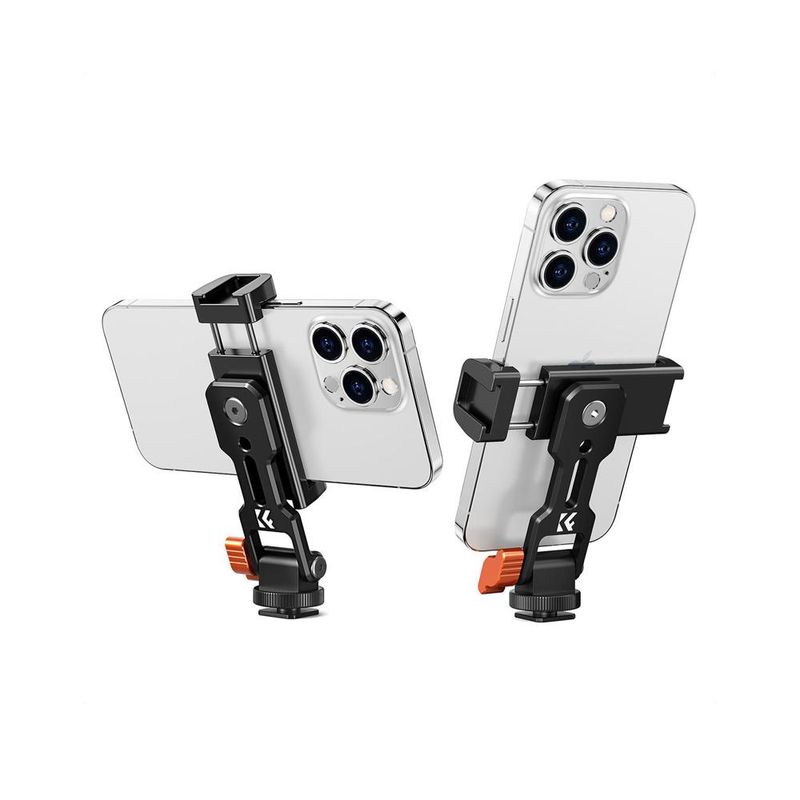 Este robusto soporte metálico para smartphone es compatible con dispositivos de 6 a 9 cm de ancho. Los puertos de zapata fría giran, lo que permite ajustar el ángulo de montaje y ofrece máxima comodidad y flexibilidad al disparar.