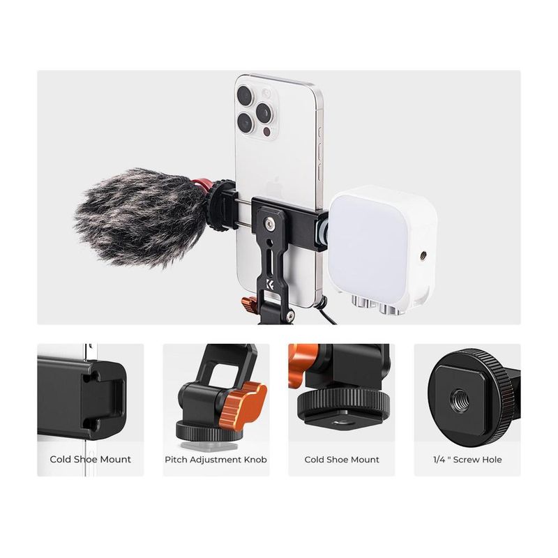 El soporte para teléfono para trípode tiene orificios roscados estándar de 1/4" en la parte inferior y un conector de zapata fría adicional, compatible con trípodes, palos para selfies, monópodes, cámaras, estabilizadores y otros accesorios.