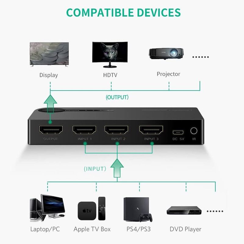 TV y Cine en CasaHDMI, Audio y VideoSwitch HDMI 3 Puertos 4K 3D HDR UGREEN con Control 3 x 1 60Hz