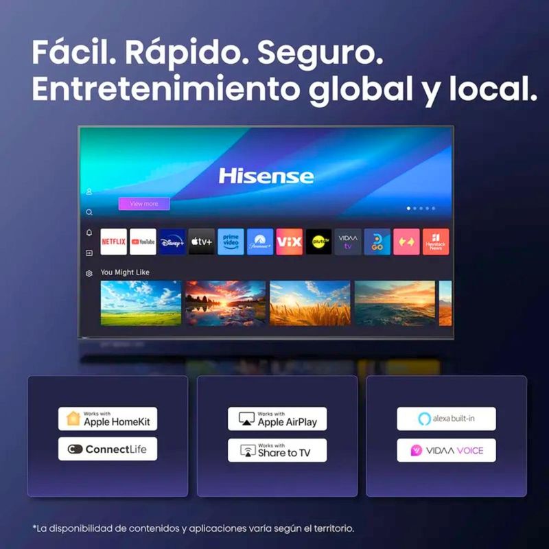 El Hisense 58Q6QV es un televisor inteligente (Smart TV) de 58 pulgadas con tecnología QLED y resolución 4K Ultra HD, diseñado para ofrecer una excelente calidad de imagen con colores vivos y buen contraste gracias al uso de puntos cuánticos (Quantum Dot) y compatibilidad con Dolby Vision, HDR10 y HLG. Funciona con el sistema operativo VIDAA U6, que proporciona acceso rápido a aplicaciones de streaming populares como Netflix, YouTube y Disney+, además de contar con características como atenuación local (local dimming) para mejorar los niveles de negro y una tasa de refresco nativa de 60 Hz ideal para ver películas y programas de televisión.