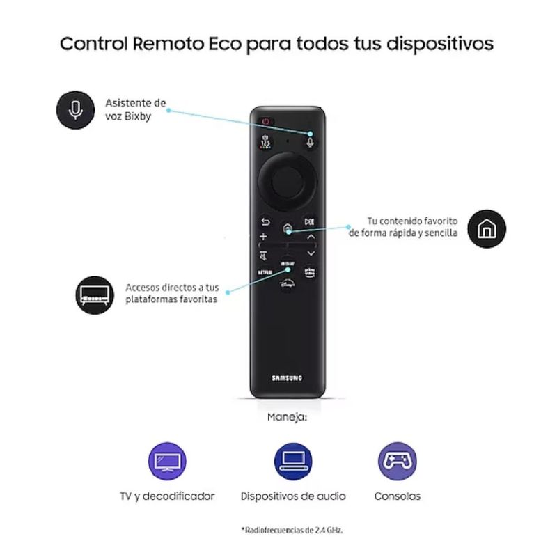 Funciones inteligentes y sistema operativo El televisor opera con sistema Tizen de Samsung, proporcionando acceso a aplicaciones populares de streaming como Netflix, Amazon Prime Video, Disney+, YouTube y más. Integra servicios como Samsung TV Plus para canales gratuitos y juegos en la nube con el Gaming Hub.