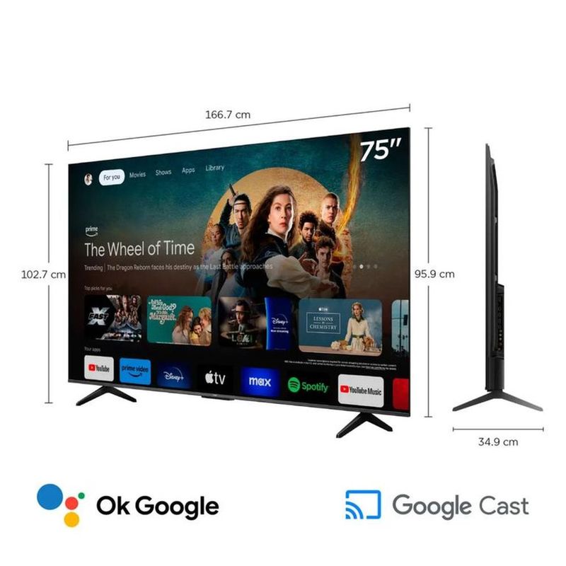 Google TV , control por voz, conectividad Bluetooth y Wi-Fi, y tecnología QLED que ofrece colores más vivos y contraste profundo. Perfecto para disfrutar tus series, películas y juegos favoritos en una pantalla gigante.