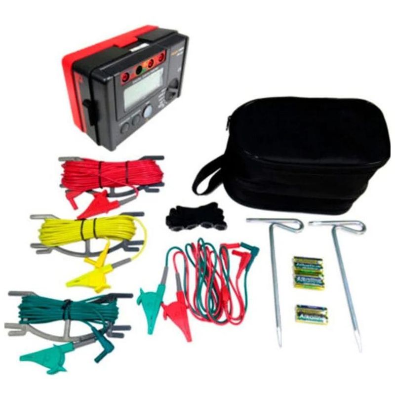 Descripción Telurometro Digital Prasek PR-521, Medidor de Resistencia de aislamiento 2000 OHM. ESPECIFICACIONES FUNCIÓN RESISTENCIA DE TOMA DE TIERRA (Ohm): 20 Ohm / 200 Ohm / 2000 Ohm ±(2%+3) TENSIÓN AC DE TOMA DE TIERRA (V): 200 V ±(1.0%+4) FUNCIONES ESPECIALES CONTADOR DISPLAY: 2000 RANGO MANUAL: Si AUTO OFF: Si (10 minutos) INDICADOR DE BATERÍA BAJA: Si RETENCIÓN DE DATOS: Si REGISTRO DE DATOS: 20 PANTALLA RETROILUMINADA: Si PANTALLA COMPLETA DE ICONOS: Si DOBLE PROTECCIÓN DE AISLAMIENTO: Si DISPLAY FUERA DE RANGO: Display “OL» PRUEBA SIMPLE DE 2 CABLES: Si PRUEBA DE PRESICIÓN DE 3 CABLES: Si CARACTERÍSTICAS GENERALES ALIMENTACIÓN: 6 Pilas Alcalinas AA 1,5V (LR6) DISPLAY: 70.6mm x 34mm COLOR: Rojo y gris PESO: 560g DIMENSIONES: 160mm x 100mm x 70.5mm ACCESORIOS: 6 Pilas Alcalinas AA Estuche Certificado de calibración de fábrica Juego de puntas Manual Cualquier pregunta o duda hacerla en la caja de comentarios