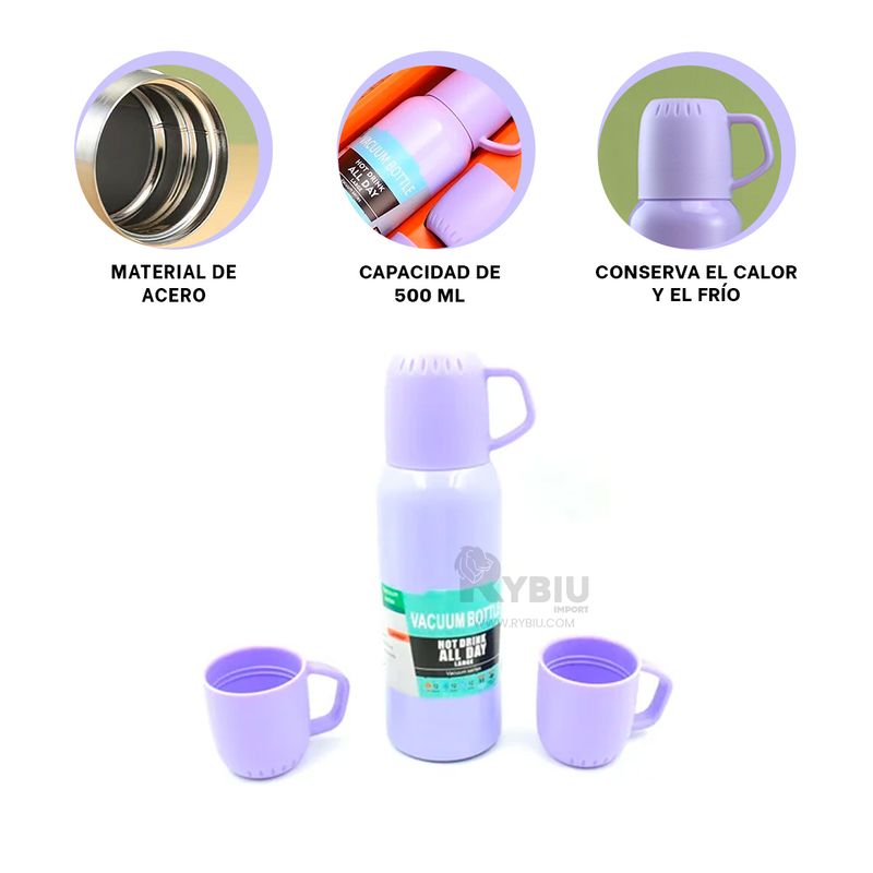 Atractivo termo de acero en un bonito color lila con 3 tazas. Gracias a este producto tu bebida se mantendrá caliente y lista para tomar durante más tiempo. Además, si te encantan las bebidas frías, este producto es muy adecuado para ti. Gracias a su diseño inteligente podrás transportarlo a cualquier lugar, ya sea a la oficina o fuera de casa. Haz ejercicio al aire libre y también puedes llevarlo al gimnasio para llevar proteínas. El juego de termo incluye 3 tazas, perfecto para compartir y disfrutar de tus bebidas con amigos. El material de acero lo hace duradero. Observaciones adicionales: las fotografías y descripción del producto son referenciales. Producto sujeto a stock de colores. Garantía: 7 días por daños de fábrica. El Modelo de los(el) regalo(s) está sujeto a disponibilidad de stock y colores.