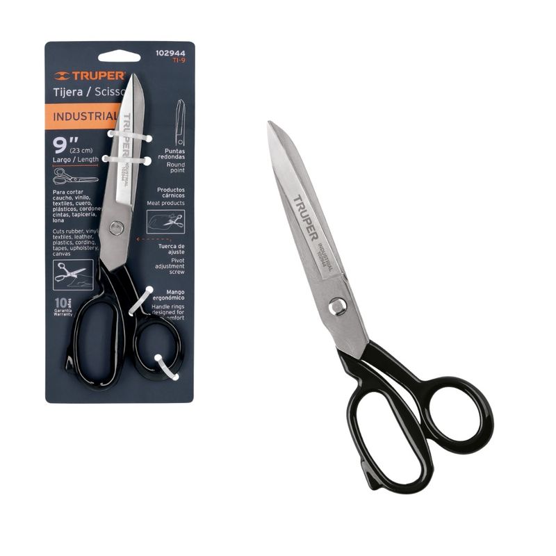 Tijera industrial Truper TI-9 de 9 pulgadas, diseñada especialmente para sastres y trabajos de confección. Su construcción robusta y filo preciso garantizan cortes limpios en telas gruesas y delgadas, ofreciendo durabilidad y comodidad en cada uso.