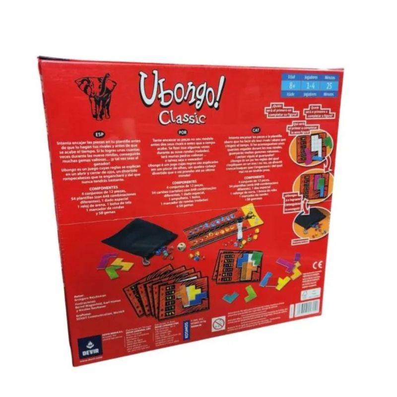 TREPIDANTE! ADICTIVO! INGENIOSO! Trepidante porque todos los jugadores intentan encajar las piezas en su plantilla simultáneamente. Cada jugador tendrá una plantilla y 12 piezas. Un jugador tirará el dado y le dará la vuelta al reloj de arena. El símbolo que aparezca en el dado indicará qué piezas se deben utilizar. Luego cada jugador intentará completar su figura tan deprisa como pueda con las piezas correspondientes. El más rápido deberá gritar “¡Ubongo!” cuando haya terminado y luego podrá mover su ficha y coger dos gemas. El resto de jugadores deberán seguir jugando sin detenerse: mientras el reloj de arena siga corriendo todavía tendrán tiempo de completar la plantilla y así conseguir un par de gemas. Al final, el jugador que tenga más gemas de un mismo color será el ganador de la partida. Y no siempre habrá un ganador.