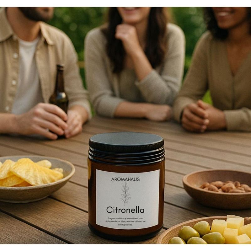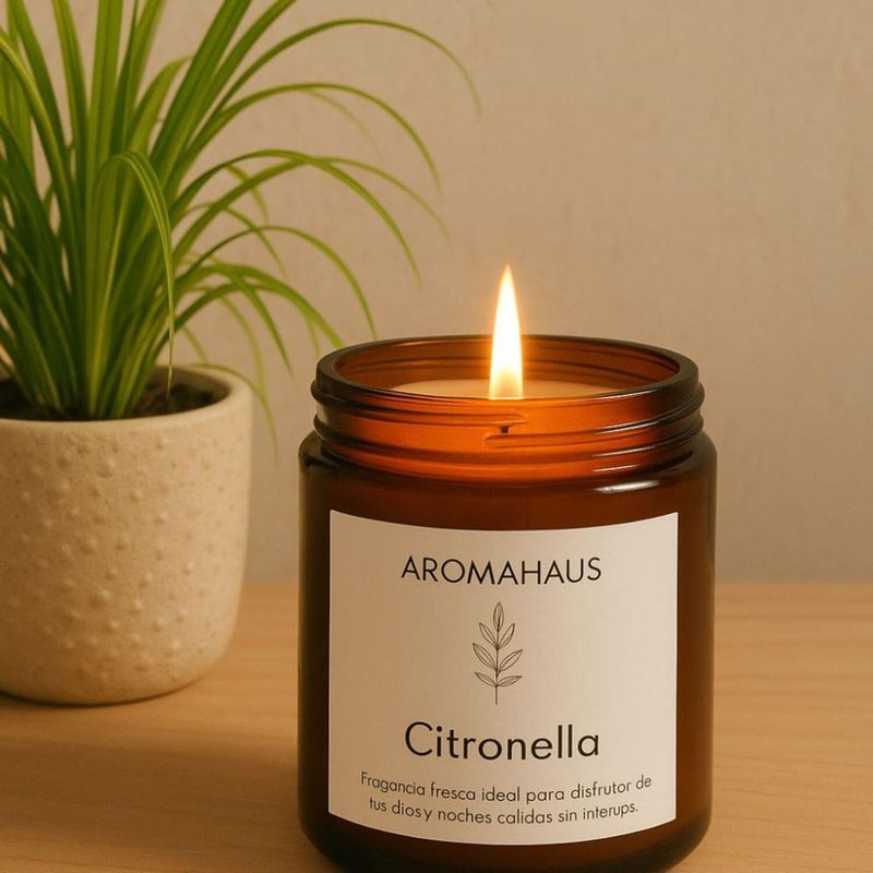 vela de soya aroma Citronella conocida por sus propiedades de mantener alejado a los mosquitos de forma natural.De aroma fresco y citrico te mantiene libre de molestias en la terraza, piscina,cenas al aire libre o culaquier lugar que quieras mantener protegido tanto interior como exteriormente .Prende la vela , espera que desprenda su perfume y disfruta de momentos tranquilos ya que nuestros productos decoran, perfuman y cumplen un proposito.