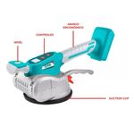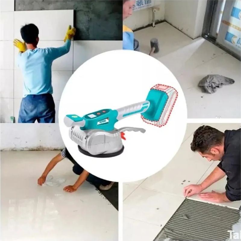 Ideal para profesionales del sector de la construcción, instaladores de cerámicos y especialistas en acabados, este equipo se convierte en una herramienta indispensable para lograr un acabado perfecto y uniforme en todo tipo de superficies planas.El Vibrador de Mayólica con Ventosa 20V modelo TTVLI2010 de la línea industrial de Total Tools está diseñado para facilitar la instalación de cerámicos, vidrios y losetas de gran tamaño. Este equipo permite realizar movimientos precisos y seguros durante la colocación de superficies lisas sin necesidad de fuerza excesiva ni múltiples operarios, optimizando así el tiempo y esfuerzo en trabajos de construcción o remodelación.