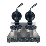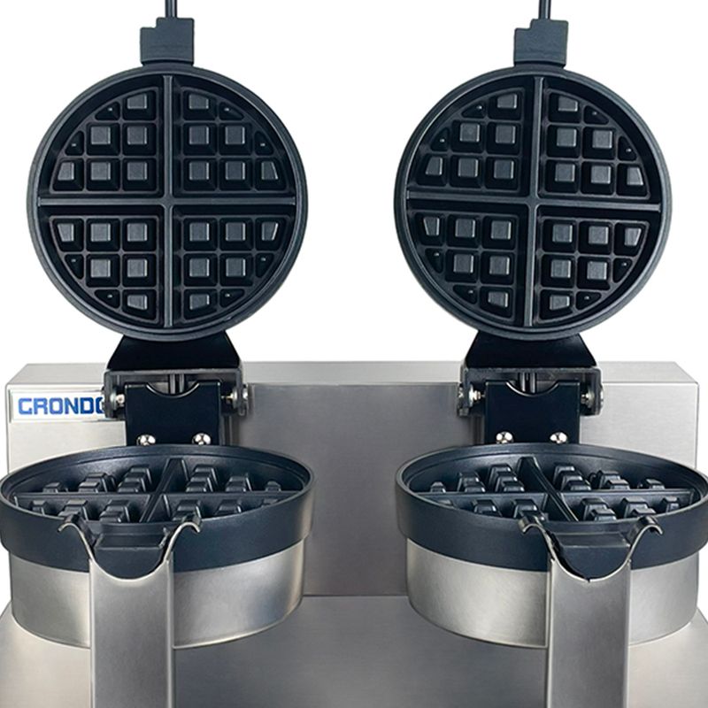 Equipo comercial para preparación rápida de waffles. Estructura giratoria en acero inoxidable y placas antiadherentes para máxima productividad.