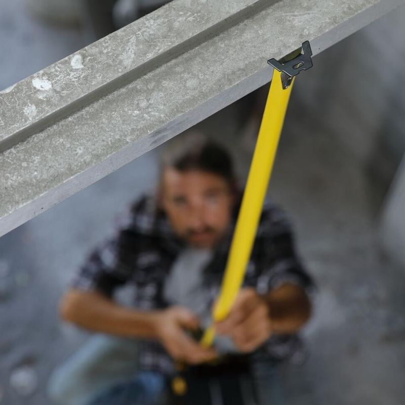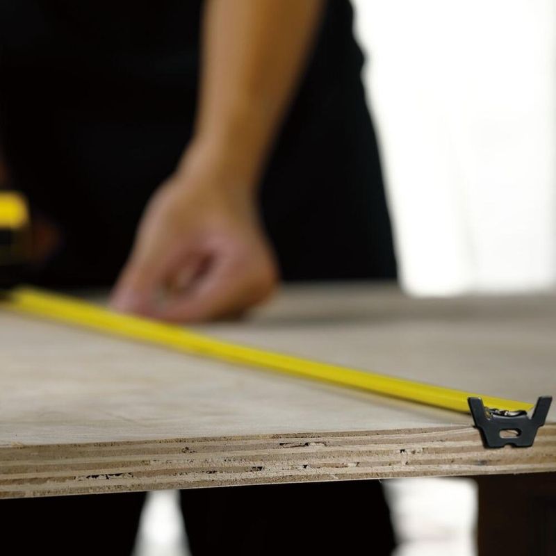 Cinta métrica con botón de tranca, gancho cero absoluto que permite mayor precisión, resorte tratado a calor para una mayor vida útil y una caja bi-material.